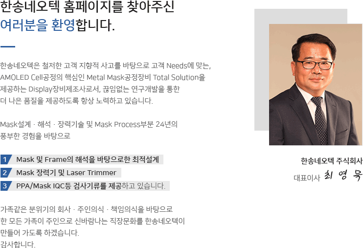 경북 구미에 소재한 한송네오텍은 차세대 디스플레이인 유기발광다이오드(OLED)의 핵심공정장비 제조업체로 세계 최고 수준의 OLED Mask Line 장비 설계와 해석, 인장기술을 보유하고 있다. 중화권 시장을 공략해 중국의 BOE, GVO, CSOT 등 우량거래처를 확보하고 있는 글로벌 강소기업이라고 중진공은 설명했다.