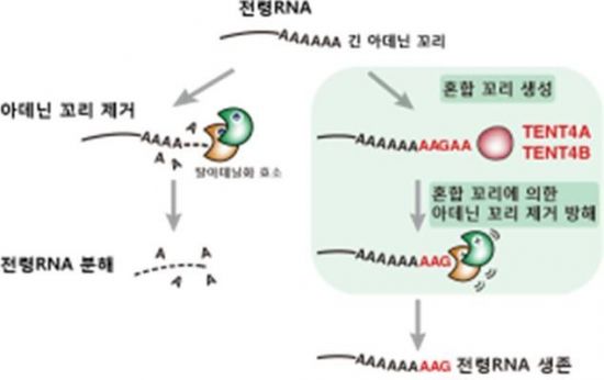 [아시아경제 김철현 기자] 국내 연구진이 '전령RNA'의 분해를 막는 '혼합 꼬리'를 발견해 전령RNA의 생애와 유전자 조절에 관한 새로운 이해의 틀을 마련했다. 전령RNA(mRNA)는 DNA에 보관돼 있는 유전 정보를 단백질로 전달해주는 매개체로, 모든 생명 활동에 핵심인 물질이다.