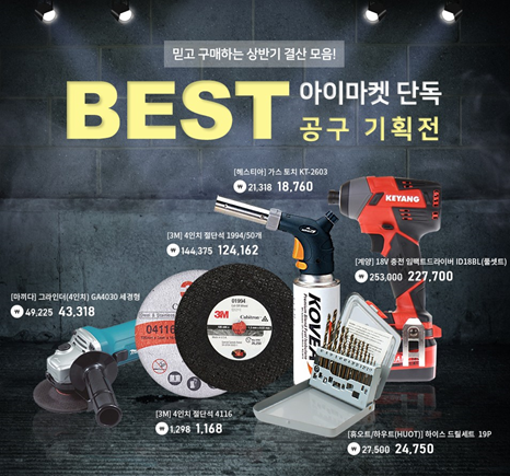 주요 제품은 디월트 18V 충전 임팩트 드라이버 풀세트(34만7820원), 보쉬 4인치 디스크그라인더(5만2030원), 마끼다 4인치 그라인더(4만3318원) 3M 4인치 절단석(1168원) 아임삭 14.4V 충전 해머 드릴(14만6094원), 하우트 하이스 드릴세트 19PCS(2만4750원) 등이다.