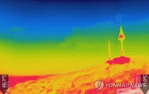 2일 오후 서울 남산에서 열화상 카메라로 촬영한 도심 일대가 붉게 표시된다. 온도가 높을수록 붉은색, 낮을수록 푸른색으로 표시된다.(연합뉴스)