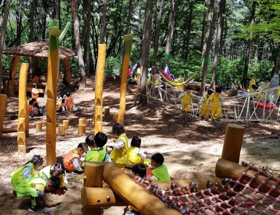 산림자원을 활용한 물모래 놀이터, 나무위의 집, 숲속 운동장 등 다양한 숲 체험으로 유아들에게 모험심과 호기심을 자극한다.