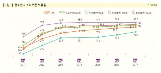 청소년의 스마트폰 보유율은 전체 연령대에 비해 매년 높은 수준을 보였다. <자료:KISDI>