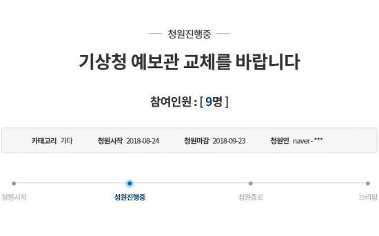 24일 오전 청와대 국민청원 게시판에는 '기상청 예보관 교체를 바랍니다', '기상청을 없애주세요' 등 태풍예보를 제대로 하지 못한 기상청을 징계해야 한다는 청원글이 33건 올라왔다. 한 청원인은 청원개요에서 "일본은 이번 태풍 피해지역에 서울ㆍ경기는 제외시켰는데 우리는 예측 실패로 학교, 유치원 등을 휴교ㆍ휴원 시켰네요. 어떻게 우리나라 기상을 일본기상청이 더 잘 맞추는지 이해가 안가네요"라며 "이번 오보에 대한 입장표명과 단호한 인사이동을 통해 신뢰가 생기는 기상청이 됐으면 합니다"라고 밝혔다.