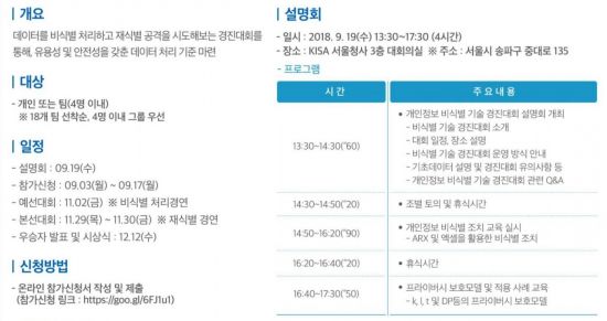 이번 대회는 예선(11월2일)과 본선(11월29~30일)으로 진행된다. 예선에서는 참가자들이 KISA 개인정보비식별지원센터에서 마련한 약 33만개의 가상 데이터셋을 비식별 조치하고, 본선에서 타 참가자들이 비식별 처리한 데이터에 대해 재식별을 시도하는 방식으로 진행된다. 평가를 거쳐 3개 우수팀을 선발해 총 600만원의 상금을 수여한다.