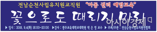 이길훈 순천교육장은 “이번 연수를 통해 아동학대 예방교육에서 유아 권리 존중교육으로 패러다임이 변해야만 한다는 것을 강조하고, 원장선생님부터 교사들의 권리를 존중하는 실천이 중요하다”고 말했다.