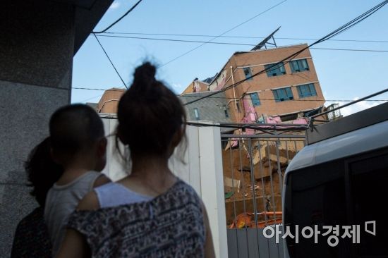7일 서울 동작구 상도동 다세대주택 공사장 흙막이가 무너져 인근에 있는 상도유치원 건물이 기울어져 있다./강진형 기자aymsdream@