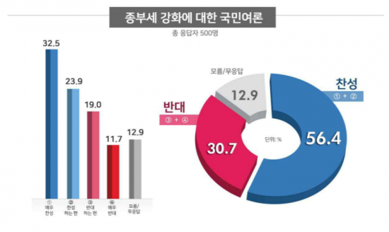 종합부동산세 강화에 '반대한다'는 응답은 30.7%(매우 반대 11.7%, 반대하는 편 19.0%)에 그쳤다. '모름·무응답'은 12.9%.