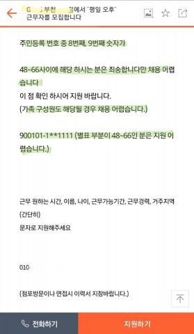 [아시아경제 윤신원 기자] “주민번호 중 8번째, 9번째 숫자가 48~66 사이에 해당하시는 분은 죄송합니다만 채용 어렵습니다. 가족 구성원도 해당될 경우 채용 어렵습니다.”
