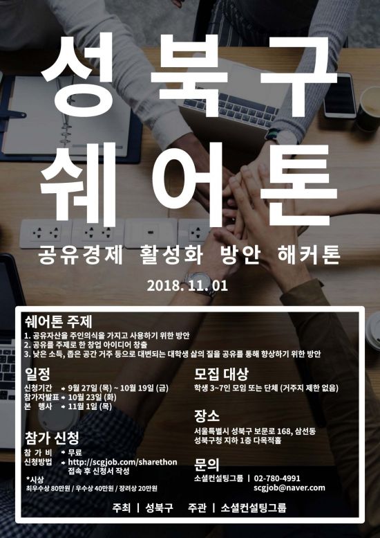 공유경제 아이디어 창출을 위한 ‘성북구 쉐어톤’ 관련 기타 궁금한 사항은 성북구 마을사회적경제과(☎2241-3893)로 문의하면 된다.