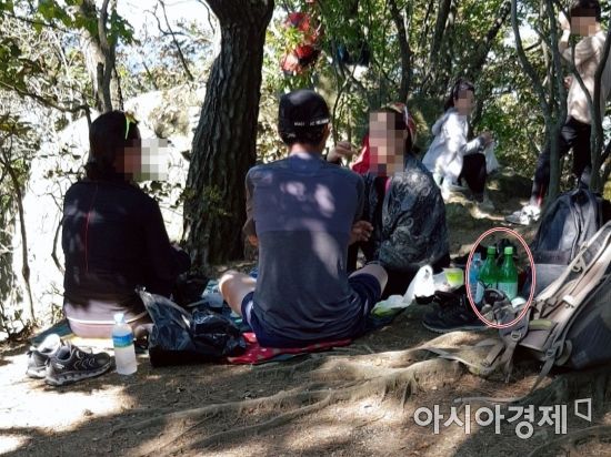 지난달 29일 오후 서울과 경기도 경계에 있는 청계산 정상에서는 막걸리 냄새가 풍겨왔다. 돗자리를 깔고 점심 및 간식을 먹고 있는 등산객들 사이사이로 초록색 페트병이 놓여 있었다. 막걸리였다.