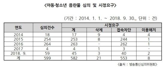 이중 아동·청소년 음란물에 대한 심의는 2017년 4건에서 2018년 9월 기준 59건으로 늘어났다. 이 추이대로라면 올해 말까지 작년 대비 17배는 늘어날 것으로 보인다.