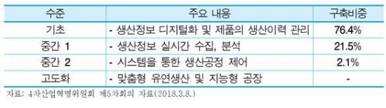 국회 산업통상자원중소벤처기업위원회 소속 어기구 더불어민주당 의원에 따르면 정부가 현재까지 보급한 스마트공장 사업은 기초 수준에 76.4%가 집중됐으며, 고도화 수준의 구축은 전무한 것으로 나타났다. 중간1 수준은 21.5%, 중간2 수준은 2.1%로 조사됐다.