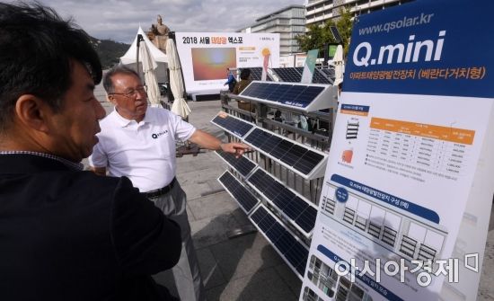 1일 서울 광화문광장에서 열린 '2018 서울 태양광 엑스포'에서 시민들이 베란다 거치형 태양광 발전장치를 살펴보고 있다. 이번 엑스포는 2022년까지 태양광 1GW를 보급하는 '2022 태양의 도시, 서울'의 본격 추진을 알리는 의미와 함께 태양광에 대한 시민의 관심을 고취시키기 위해 마련됐다./김현민 기자 kimhyun81@