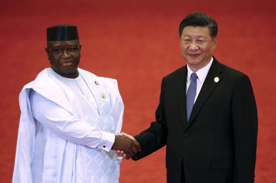 중국을 방문한 줄리어스 마다 비오 시에라리온 대통령(왼쪽)이 시진핑 중국 국가 주석과 악수를 나누고 있다. [이미지출처=AP연합뉴스]