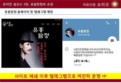 12일 자유한국당 송희경 의원은 과학기술정보방송통신위원회 국정감사에서, 유흥탐정 사이트 폐쇄 이후에도 메신저 텔레그램을 통해 여전히 성행 중이라는 제보에 따라 직접 의뢰해서 받은 성매매업소 출입이력 조회 사례를 공개했다.