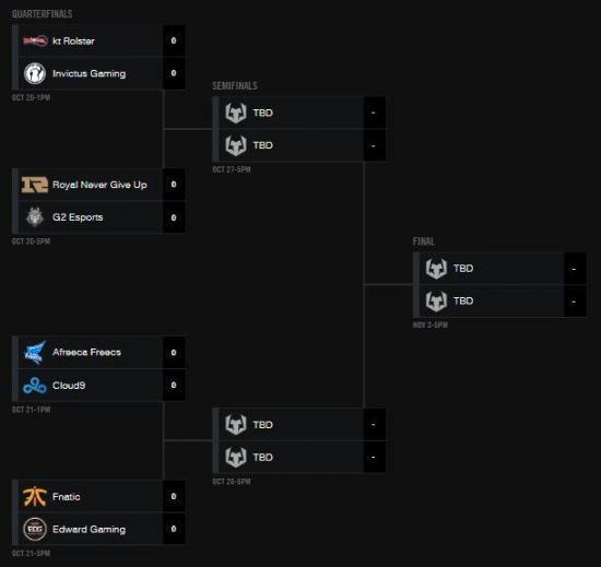 20일부터 21일까지 부산 벡스코 오디토리움에서 진행되는 8강에는 한국의 'kt 롤스터(kt)', '아프리카 프릭스(아프리카)', 중국의 '로얄 네버 기브업(RNG)'와 '에드워드 게이밍(EDG)', '인빅터스 게이밍(IG)', 북미 '클라우드9(C9)', 유럽의 '프나틱', 'G2 e스포츠(G2)'가 진출에 성공했다.