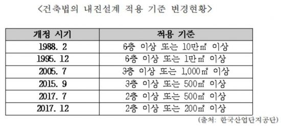 그러나 우리나라는 지진 안전지역이라는 인식에 따라 1988년 최초로 '건축법'에 내진설계 적용 기준이 도입됐기 때문에 1988년 이전에 건설된 시설물의 경우 내진설계에 대한 법적인 의무가 없어 내진성능이 확보돼 있지 않을 가능성이 높다고 우려했다. 게다가 1988년 처음 만들어진 내진설계 기준은 '6층 이상 또는 10만㎡ 이상'으로 현재 기준인 '2층 이상 또는 200㎡ 이상'에 비하면 미흡하다.