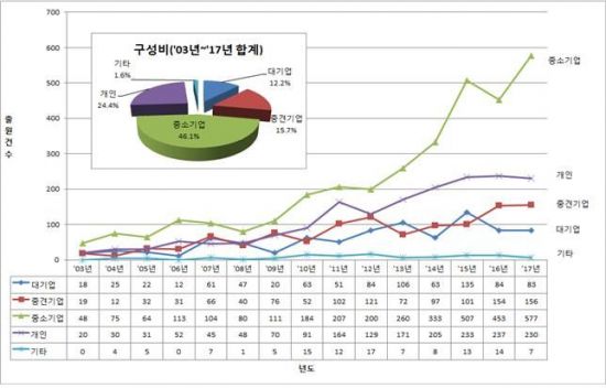 단 출원인 유형별 비중에선 중소기업이 46.1%, 개인 24.4%, 중견기업 15.7%, 대기업 12.2% 등의 순을 보여 대기업보다 중소·중견기업과 자영업자들의 출원이 상대적으로 활발한 것으로 파악된다.