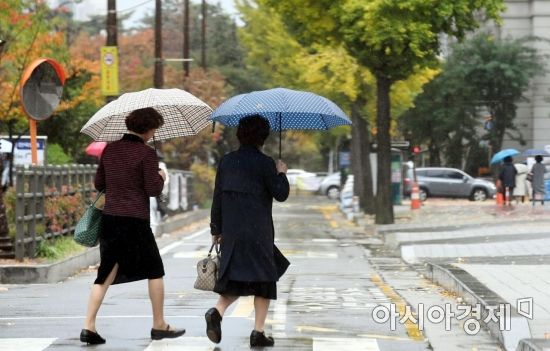 비가 내린 28일 서울 영등포구 여의도 거리에서 시민들이 우산을 쓴 채 발걸음을 재촉하고 있다./김현민 기자 kimhyun81@