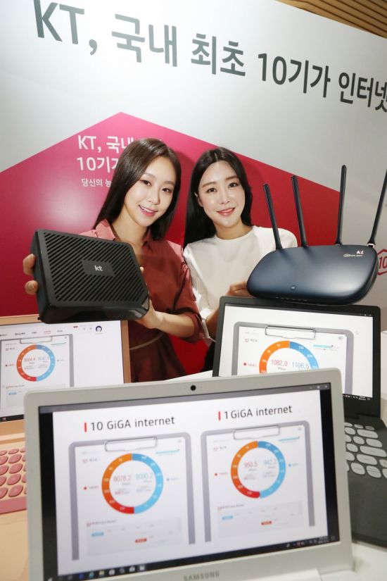 KT는 '10기가 인터넷'을 전국 주요도시에서 31일부터 서비스 한다고 이날 밝혔다. 10기가 인터넷(10Gbps)은 1초에 10억비트를 보내거나 받을 수 있다는 뜻이다. 2014년 '기가 인터넷'이란 이름으로 1Gps 유선 인터넷을 출시한 후 4년만에 속도가 10배 빨라진 것이다. 10Gbps는 4기가바이트(GB) 영화 한 편을 약 3초만에, 33GB UHD(초고화질) 동영상은 30초만에 내려받을 수 있는 속도다.