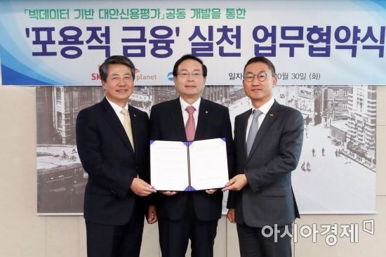 SK그룹과 SK플래닛, 우리은행은 30일 우리은행 본점에서 금융소외계층 지원을 위한 ‘대안 신용평가’ 공동 개발 업무협약을 체결했다. 왼쪽부터 최광철 SK그룹 사회공헌위원장, 손태승 우리은행장, 이인찬 SK플래닛 대표이사.