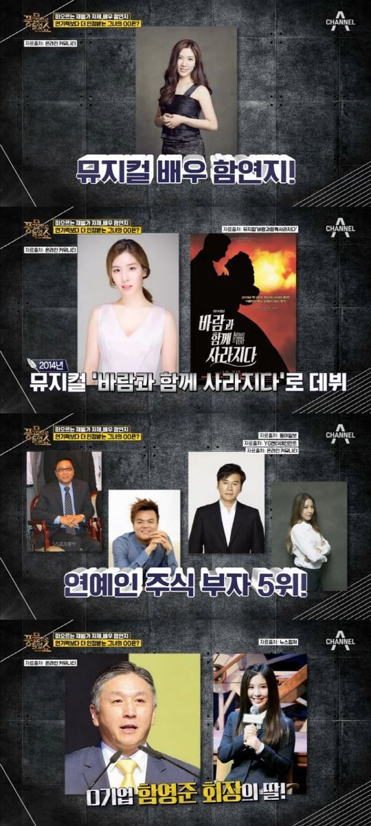 29일 방송된 채널A '풍문으로 들었쇼'(풍문쇼)에 출연한 한 패널은 "함연지는 이수만. 박진영, 양현석과 어깨를 나란히 할 정도로 굉장히 많은 주식을 갖고 있는 연예인 주식 부자 5위에 이름을 올렸다"고 밝혔다. 또 다른 패널은 "함연지가 보유한 주식만 311억원"이라고 말해 출연진을 놀라게 했다.