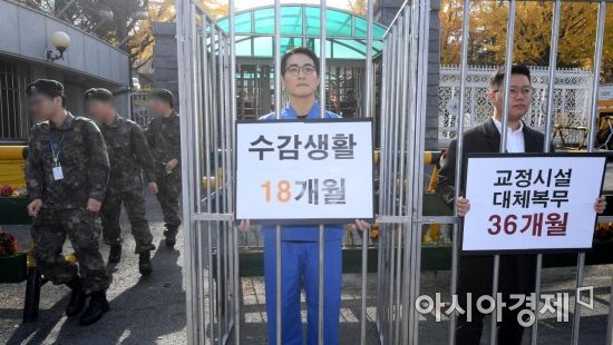 5일 서울 용산구 국방부 앞에서 열린 양심적 병역거부 징벌적 대체복무제안 반대 긴급 기자회견에서 참여연대를 비롯한 시민사회단체 관계자들이 퍼포먼스를 하는 가운데 군인들이 그 옆을 지나고 있다./김현민 기자 kimhyun81@
