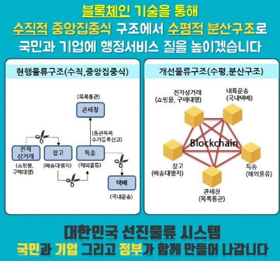 이번 사업은 지난 6월 발표한 '블록체인 기술 발전전략'의 핵심 추진과제인 6대 공공시범사업 중 하나로 관세청과 협업해 진행해 왔다. 전자상거래 물품 수입에서 운송업체는 전자상거래업체의 물품 주문정보와 자사의 운송정보를 취합한 총 28종의 물품별 통관정보를 목록화해 세관장에게 제출해야 한다. 이때 운송업체와 전자상거래업체간 물품정보 전달과 운송업체의 목록작성이 수작업으로 이뤄지고 있는 실정이다. 이로 인해 저가신고, 허위신고 등의 가능성이 있어 통관목록의 가격·품명·구매자 정보의 신뢰성이 높지 않은 게 현실이며 정보 전달 단계별로 많은 인력이 비효율적으로 투입되고 있다. 또한 구매자는 물품 주문 이후 배송현황, 세관 신고정보, 통관현황 등 본인 물품에 대한 통관정보를 실시간으로 파악하기 어렵다.