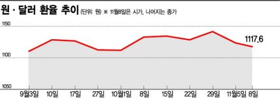 8일 서울외환시장에서 원ㆍ달러 환율은 오전 11시8분 현재 전거래일보다 4.4원 내린 1118.9원에 거래됐다. 이날 환율은 전날 장중 저가와 동일한 1117.6원에 출발했다. 이는 장중저가 기준으로 지난달 2일(1112.5원) 이후 최저치였다. 이 같은 달러 약세는 전날(현지시간) 달러 인덱스의 하락으로 예상됐던 수준이다. 주요 6개국 통화 대비 미 달러화 가치를 나타내는 미 달러 인덱스는 전일 대비 0.16% 하락한 96.16을 기록했는 데 장중에는 95.80까지 떨어졌다.