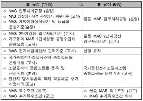 이밖에 조달청은 지난 2006년 이후 복잡해진 다수공급자계약 규정을 11종에서 6종으로 통·폐합, 계약 절차에 맞게 전면 개편하고 시장 특성 및 제도 운영 절차가 상이한 물품과 용역의 규정을 분리해 공공기관과 조달업체 등 고객의 이해도를 높여나갈 예정이다.