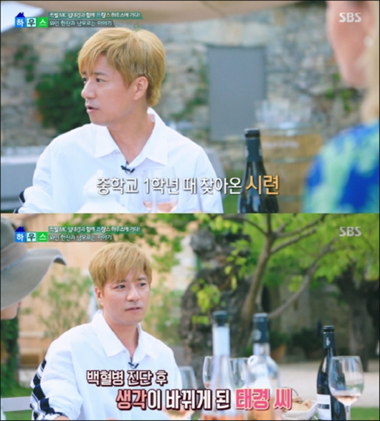임태경은 "원래 건강한 아이었다. 그런데 14살 때 갑자기 백혈병이라는 시련이 다가왔다"고 밝히며 "아무래도 하늘이 나에게 기고만장하지 말라고 준 병인 것 같다"고 말했다.