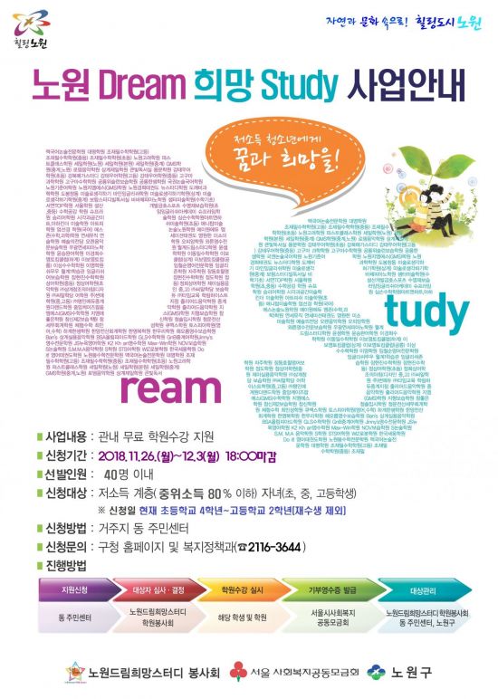 [아시아경제 박종일 기자] 노원구(구청장 오승록)는 저소득층 가정 학생들에게 사설학원 무료수강 기회를 주는 ‘노원드림! 희망 스터디’ 대상자를 모집한다.