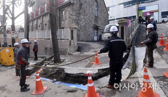 경찰과 소방 관계자들이 25일 서울 서대문구 충정로 KT아현국사 앞 공동구 화재현장에서 전날 발생한 화재 원인을 조사하기 현장 감식을 하고 있다./김현민 기자 kimhyun81@