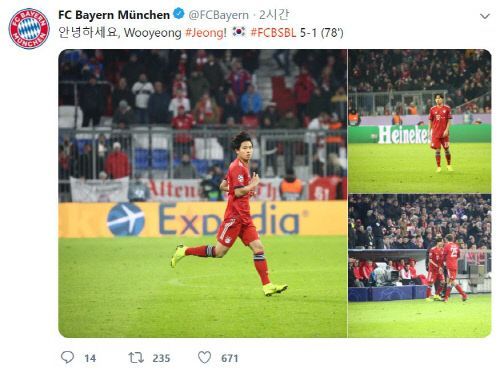 독일 축구팀 FC 바이에른 뮌헨이 공식 SNS를 통해 축구선수 정우영의 데뷔를 축하했다. / 사진=바이에른 뮌헨 트위터 캡처