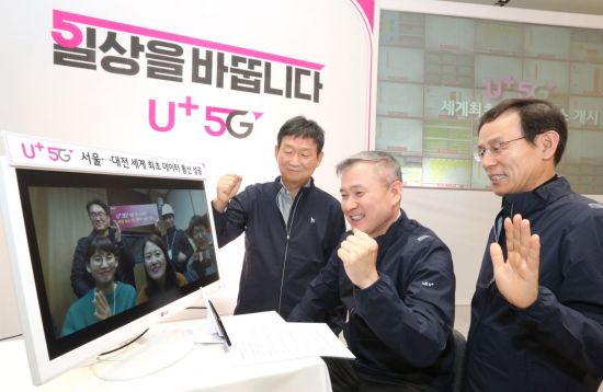 하현회 LG유플러스 부회장이 1일 5G 화상통화 중이다. 모니터와 하 부회장(중간) 사이에 위치한 검은색 폰이 삼성전자의 5G스마트폰 시제품이다.