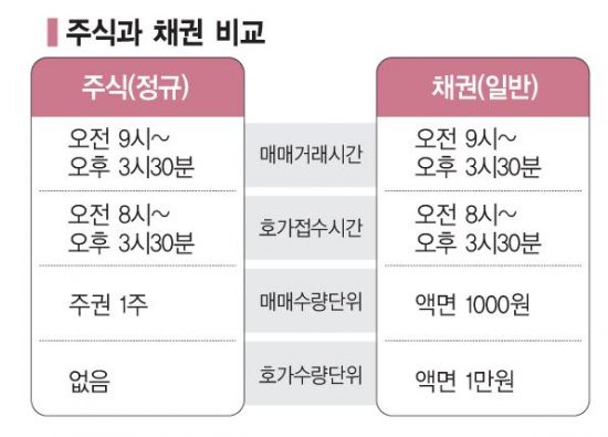채권은 주식과 마찬가지로 매일 오전 9시부터 오후 3시30분까지 매매가 가능하다. 매매 대상 채권은 거래소에 상장된 국채, 지방채, 특수채, 전환사채(CB), 신주인수권부사채(BW), 교환사채(EB), 일반 사채권 등이다.