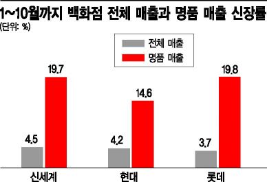 아이러니하게도 주요 백화점에서는 명품이 날개 돋친 듯 팔려나갔다. 관련 업계에 따르면 올해 1~10월까지 백화점 3사의 명품 매출은 신장률이 모두 두 자릿수를 기록하며 호실적을 거뒀다. 신세계백화점의 명품 매출은 19.7%, 현대백화점은 14.6%, 롯데백화점은 19.8%에 달했다.