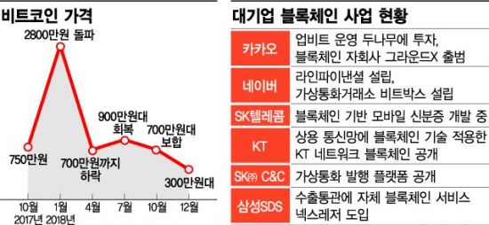 ◆대기업은 블록체인에 역량 집중=이 과정에서 블록체인 개발의 중심 축은 자금력이 탄탄한 대기업으로 옮겨가고 있다. 대표적으로 SK C&C는 글로벌 기업 컨센시스와 블록체인 서비스를 쉽고 빠르게 개발할 수 있는 플랫폼을 만들고 있다. 기업들이 원하는 블록체인 서비스를 만들 수 있는 맞춤형 개발 허브로 시장을 선점하겠다는 전략이다. 거래소 업비트를 운영하는 두나무에 투자했던 카카오도 최근 블록체인 플랫폼 ‘클레이튼’의 파트너사를 30개로 늘렸다. 역시 블록체인 시장 생태계를 조성하겠다는 것이 목표다. 일본 자회사를 통해 블록체인 시장을 공략하고 있는 네이버는 라인파이낸셜을 설립해 일본 금융청(FSA)에 가상통화거래소업 등록을 신청했다. 메신저와 금융을 접목해 생활 속에 스며드는 블록체인 기술은 선보일 것으로 전망된다.