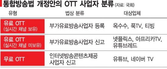 ◆국내 서비스는 등록, 해외 서비스는 신고만 = 8일 업계에 따르면 김성수 더불어민주당 의원이 대표 발의한 통합방송법에 따르면 실시간 스트리밍 서비스를 제공하는 옥수수, 푹TV, 티빙 등 국내 온라인동영상서비스(OTT)는 '부가유료방송사업자'로 분류돼 등록을 해야 한다. 반면 실시간 서비스 넷플릭스는 부가유료방송사업자로 분류하되 등록이 아닌 신고만 하면 된다. 유튜브는 월정액으로 서비스되는 유튜브레드의 경우 부가유료사업자이지만 일반 유튜브는 인터넷방송콘텐츠제공 사업자로 역시 단순 신고 대상이다.