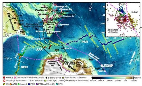 극지연구소(소장 윤호일)는 '질란디아-남극 맨틀'로 명명된 새로운 타입의 맨틀이 남극, 뉴질랜드, 호주 동편 영역 아래에 분포한다는 사실을 발견했다고 29일 밝혔다. 태평양형 맨틀이 호주-남극 부정합 아래에서 인도양형 맨틀과 접하면서 인도양을 향해 흘러 들어가고 있다는 것이 30년 동안 통용되던 학설이었다.