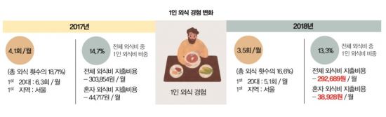 다만 1인 외식횟수는 2017년 4.1회에서 다소 감소한 수치였고 전체 외식횟수 중 16.6%를 차지하고 있었다. 횟수 감소에 따라 1인 외식비용 역시 월평균 3만8928원으로 2017년(4만4717원)에 비해 줄어들었다. 1인 외식비용은 전체 외식비용(29만2689원)의 13.3% 수준이다.