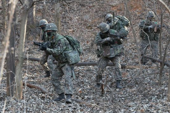 지난달 17일 오후 경기도 파주시 광탄면에서 육군 동원전력사령부 예하 72사단 장병들이 혹한기 전술훈련을 실시하고 있다. <사진=연합뉴스>