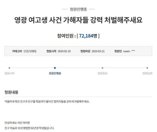 19일 청와대 국민청원 게시판에는 '영광 여고생 사건 가해자들 강력 처벌해주세요'라는 제목의 청원이 등장했다. 청원인은 자신을 '친구를 하늘로 보낸 평범한 02년생 학생'이라고 밝히며 가해자에 대한 강력한 처벌을 촉구했다.