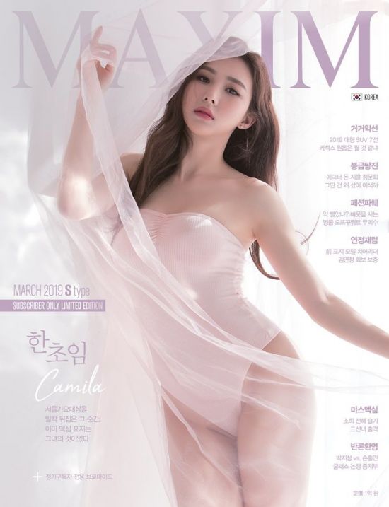 [아시아경제 온라인이슈팀] 지난달 서울가요대상 레드카펫 MC 자리에 서며 검색어 1위에 오른 걸그룹 카밀라의 한초임이 남성 잡지 맥심(MAXIM) 3월호 표지를 장식했다.