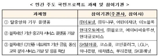 민간 전문가로 구성된 평가위원회를 통해 실현가능성, 블록체인 적용에 따른 개선 정도 등을 평가해 이중 3개 컨소시엄이 우선협상대상자로 선정됐으며 기술협상을 거쳐 3월 중순 협약 체결을 한 뒤 총 87억원 규모의 프로젝트가 시작될 예정이다. 올해 선정된 3개 민간주도 프로젝트는 ▲탈중앙화 기부 플랫폼(이포넷) ▲블록체인 기반 중고차 서비스 플랫폼 개발(현대오토에버) ▲블록체인 ID/인증 네트워크 기반 금융, 통신, 교육 분야 서비스 개발 및 응용확산(SK텔레콤) 등이다.