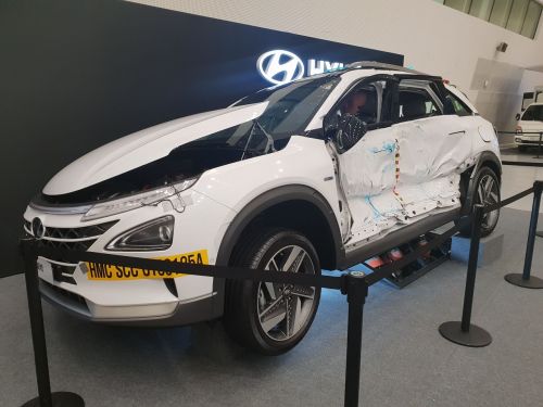 지난달 15일 동대문디자인플라자에서 열린 현대차 '어린이 안전짱 박람회'에서 충돌실험을 마친 수소전기차 넥쏘가 전시돼있다. 현대차가 시속 80km의 속도로 달리는 차량으로 충돌실험을 실시한 결과 차체는 손상됐지만 수소탱크는 그대로 보존됐다. /사진=우수연 기자