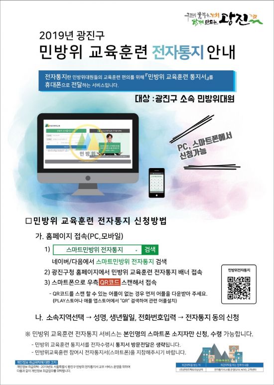 [아시아경제 박종일 기자] 광진구(구청장 김선갑)가 스마트한 민방위 교육을 위해 올해부터 민방위 교육훈련을 전자통지하고 사이버 비상소집훈련을 시행한다.