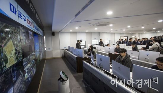 8일 서울 마포구 CCTV통합관제센터에서 열린 '마포구 CCTV통합관제센터 개소식'에서 관내 경찰 및 관제요원들이 CCTV운영 시연을 선보이고 있다./강진형 기자aymsdream@