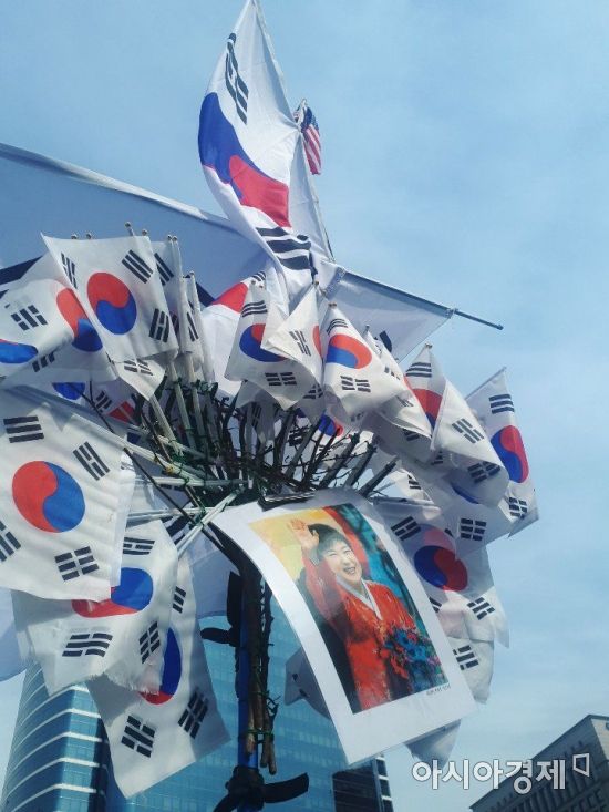 A(67) 씨가 직접 제작한 박 전 대통령 석방 기원 홍보물. 그는 수 많은 태극기 사이에 박 전 대통령 사진을 넣어 시민들에게 보이고 있었다.사진=한승곤 기자 hsg@asiae.co.kr
