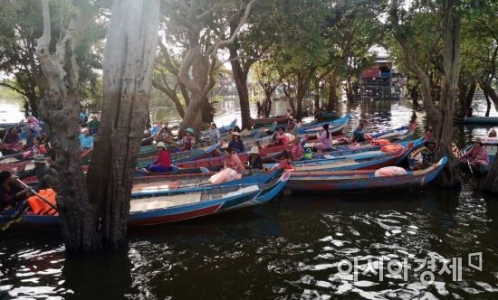 선착장 초입을 빠져나오니 곧 광활한 수평선이 보였다. 친구가 “바다가 좀 특이하지?” 라기에 믿었다. 그도 그럴 것이 톤레삽은 동남아시아에서 가장 큰 호수다. 한참을 가다 보니 바다에 수상 가옥들이 나왔다. 그러다 경찰서에 식당, 심지어 아이들이 옹기종기 모여 앉아 수업하고 있는 초등학교까지. 애매했다. 선장이 재미있는 것을 보여준다며 학교 근처에 배를 세웠다. 곧 학교에서 아이들이 쏟아져 나와 물로 들어가더니 한쪽으로 건물을 밀고 있는 게 아닌가? 물이 빠지면서 균형이 깨지면 애들과 선생님이 나와 하루에 한 차례씩 건물을 밀어 균형을 맞춘다고 했다. 그 모습이 귀여워 넋을 놓고 있는데 잠깐! 싸했다. 바다 한가운데서 아이들이 걷고 있다니! 순간 친구를 쳐다보니 이미 무릎을 꿇고 있었다. 이렇게 바보인증을 하며 곧 목적지에 도착했다. 그 순간 5분 전에 헤드록을 걸던 친구와 끌어안고 뛰었다. 눈 앞에 펼쳐진 광경을 믿을 수가 없어서다. 입이 떡 하니 벌어졌다. 이제껏 좋은 말로 해, 밀크티 같은 물색만 보다 바로 앞에 앤디 워홀의 메릴린 먼로를 형형색색 모아놓은 것 같은 색감을 보고 황홀한 기분까지 들었다. 울창한 숲이 통째로 물에 잠겨 있던 것이다.